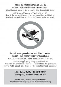 Beim Spaziergang wurden Flyer verteilt und in Redebeiträgen die Videoüberwachung aus verschiedenen Perspektiven kritisiert. Mit dabei waren auch Vertreter*innen der Kölner Initiative Kamera Stoppen. Arthur Winkelbach, einer der Sprecher der Nachbar*innen gegen Videoüberwachung, sieht in der Vielfältigkeit der kritischen Stimmen ein Mobilisierungsmoment gegen die geplante Videoüberwachung: „Unserer Meinung nach ist die Videoüberwachung keine Antwort auf die verschiedenen sozialen Probleme in der Dortmunder Nordstadt. In den Redebeiträgen bei unserem Stadteilspaziergang ist überdeutlich geworden, dass Videoüberwachung gegen unsere Grundrechte verstößt, die rassistische Stigmatisierung und Ausgrenzung verschärft, und keine Lösung für Armutsprobleme ist, und sich auch nicht für einen Kampf gegen den Rechtsextremismus geeignet ist. Wir fordern daher den Polizeipräsidenten Dortmunds, Herr Lange, auf: Nehmen Sie ihre Pläne zur Dauerüberwachung von uns Anwohner*innen der Münsterstraße zurück!“