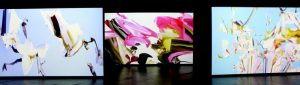 Ästhetisch ansprechend: Die Videoinstallation Flower des Künstlerduos Shinseungback Kimyonghun aus Südkorea. Auf 3 großen Videowänden werden Fotos von Blüten durch einen Bilderkennungsalgorithmus zerlegt und neu wieder aufgebaut.