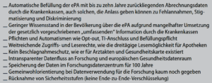Als Strukturfehler der ePA, die die Schweigepflicht von Ärzt*innen und Psychotherapeut*innen aushebelt, benennt er zusammenfassend: