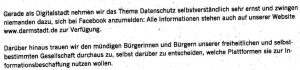 Einzig die Tatsache, dass sich der Hessische Datenschutzbeauftragte bei der Abstimmung über diesen Beschluss der Datenschutzkonferenz der Stimme enthalten hat kann den beiden Oberbürgermeistern das Signal geben: Euch passiert nichts, wenn Ihr an Euren Facebook-Fanpages festhaltet.
