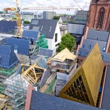 Das Stadthaus (im Vordergrund rechts) vor dem Frankfurter Dom (im Hintergrund rechts) – Foto: DomRömer GmbH