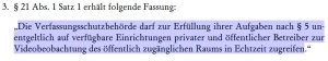 „Öffentliche Veranstaltungsorte sowie öffentliche Plätze und Infrastruktureinrichtungen werden zunehmend mit öffentlichen Videoüberwachungsanlagen ausgerüstet… ist in Zeiten einer abstrakt hohen Gefährdungslage durch terroristische Anschläge eine Zunahme von Videoüberwachung an öffentlichen Orten und auf Veranstaltungen mit großem potenziellen Schadensrisiko, wie z. B. bei Volks-festen, Umzügen und Sport- oder Musikveranstaltungen aber auch Infrastruktureinrichtungen wie Bahnhöfen und Flughäfen zu verzeichnen… Die islamistischen Terroranschläge der Vergangenheit haben gezeigt, dass die Täter gezielt den öffentlichen Raum für ihre Anschlagsziele auswählen, um möglichst großen Schaden anzurichten… Die Auswertung der Videoüberwachung kann neben Zwecken der Strafverfolgung und Gefahrenabwehr nicht zuletzt auch dem positiven Sicherheitsempfinden der Bürgerinnen und Bürger dienen. Den Verfassungsschutzbehörden können Video-und Tonaufnahmen darüber hinaus Aufschluss über komplexe Zusammenhänge terroristischer Tatbegehungen und weitere für die nachrichtendienstliche Analyse tragende Erkenntnisse geben… Zur Aufgabenerfüllung… auf verfügbare Einrichtungen zur Videobeobachtung von öffentlich zugänglichen Räumen zugreifen. Öffentlich zugängliche Räume sind örtliche Bereiche, die von jedermann betreten werden können oder bei denen die Zugänglichkeit anhand von allgemeinen Merkmalen bestimmt wird, die von jedermann erfüllt werden können. Beispielhaft sind Konzerte aber auch Bahnhöfe oder Flughäfen zu nennen. Auf eine häusliche Bedachung kommt es nicht an… werden die Betreiber von Einrichtungen zur Videobeobachtung verpflichtet, den Zutritt zu den entsprechenden Räumlichkeiten zu gewähren und die Mitbenutzung der Videobeobachtungsanlage zu dulden. Insoweit besteht eine Mitwirkungsverpflichtung der Betreiber bzw. der über die entsprechenden Räumlichkeiten verfügungsberechtigten Personen… haben die Betreiber die relevanten Daten auf Verlangen unverzüglich und unentgeltlich zur Verfügung zustellen. Es besteht insoweit eine Mitwirkungsverpflichtung.Dabei hat die Verfassungsschutzbehörde, soweit möglich, die angeforderten Bild- und Tonaufzeichnungen nach Datum, Ort und Zeit einzugrenzen und dem Betreiber mitzuteilen…“