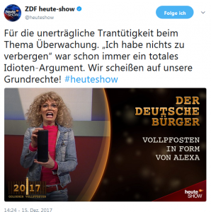 „Deutschland hat sich in diesem Jahr in einen Überwachungsstaat verwandelt ohne große Gegenwehr in der Bevölkerung. Die heute-show verleiht deshalb dem deutschen Bürger ‚für seine unerträgliche Trantütigkeit beim Thema Überwachung‘ den Goldenen Vollpfosten. Netzpolitik.org macht dafür vor allem die GroKo verantwortlich: ‚Bis zum bitteren Ende baut die große Koalition den Überwachungsstaat aus. Eine umstrittene Ausweitung wie den Staatstrojaner versteckt sie mittlerweile sogar in einem anderen Gesetz, damit es keine Debatte gibt.‘ Verbraucherschützer warnen vor dem momentan vielfach beworbenen Amazon-Assistenten Alexa.“