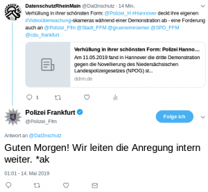 Am 11.05.2019 fand in Hannover die dritte Demonstration gegen die Novellierung des Niedersächsischen Landespolizeigesetzes (NPOG) statt. Im Vorfeld dieser Versammlung forderte ein Mitglied der Bürgerrechtsgruppe freiheitsfoo die Versammlungsbehörde Hannover schriftlich dazu auf, die drei auf dem Demo-Verlaufsweg befindlichen stationären polizeilichen Dom-Überwachungskameras für den Zeitraum der Demonstration abzudecken oder wahlweise abzubauen. Dieser Forderung ist die Polizei in Hannover nachgekommen. Sie hat drei polizeiliche Domekameras, die an der Demonstrationsstrecke errichtet sind, für die Dauer der Demonstration mit blauen Müllsäcken sichtbar verhüllt, wie ein Bericht und Fotos auf der Homepage von freiheitsfoo belegt. Zudem wird berichtet, dass alle weiteren stationären Polizei-Kameras – von der Polizei Hannover als „Stabkameras“ bezeichnet – schon seit Jahren immer dann gut sichtbar weggedreht werden, wenn eine der Versammlungsbehörde angekündigte Demonstration deren Erfassungsbereich passiert.