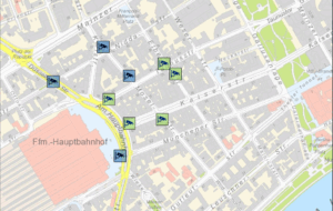 - in Grün: stationäre Überwachungskameras (errichtet und finanziert durch die Stadt Frankfurt)