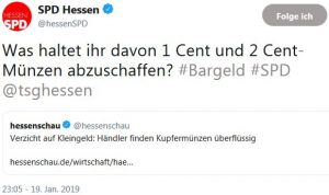 „Was haltet ihr davon 1-Cent, 2-Cent-Münzen und den 500-€-Schein abzuschaffen?“ – fragt die SPD Hessen